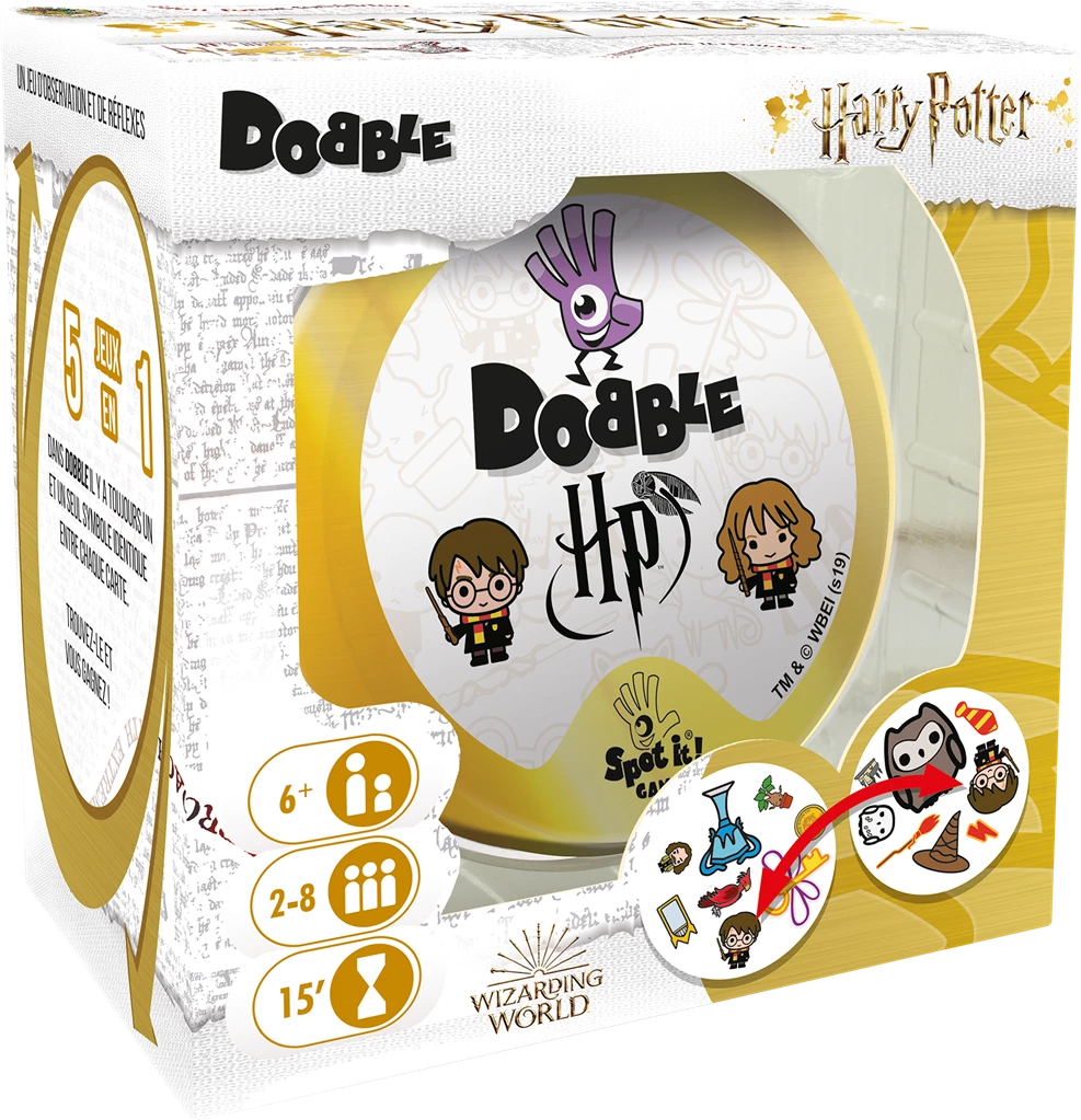 Tous les fans de Dobble et d’Harry Potter en ont rĂŞvĂ©, le voici, le Dobble Harry Potter ! Deux lĂ©gendes se retrouvent dans cette petite boĂ®te : Dobble, ses 55 cartes, ses 5 règles et son principe qui fĂ©dère toute la famille et les amis autour d’un moment convivial, et Harry Potter, la saga cĂ©lèbre dans le monde entier !