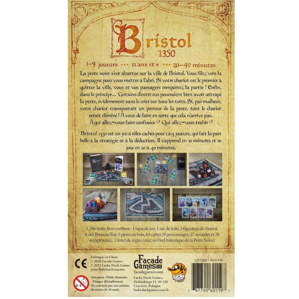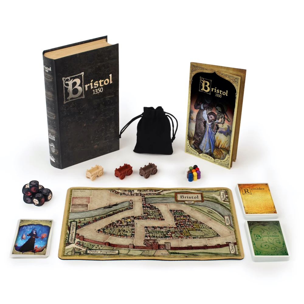 En apparence, Bristol 1350 est à la fois un jeu d’équipe coopératif, une stratégie de course et une déduction sociale. En réalité, il s’agit d’une course égoïste pour quitter la ville le plus rapidement possible sans attraper la peste, par tous les moyens !