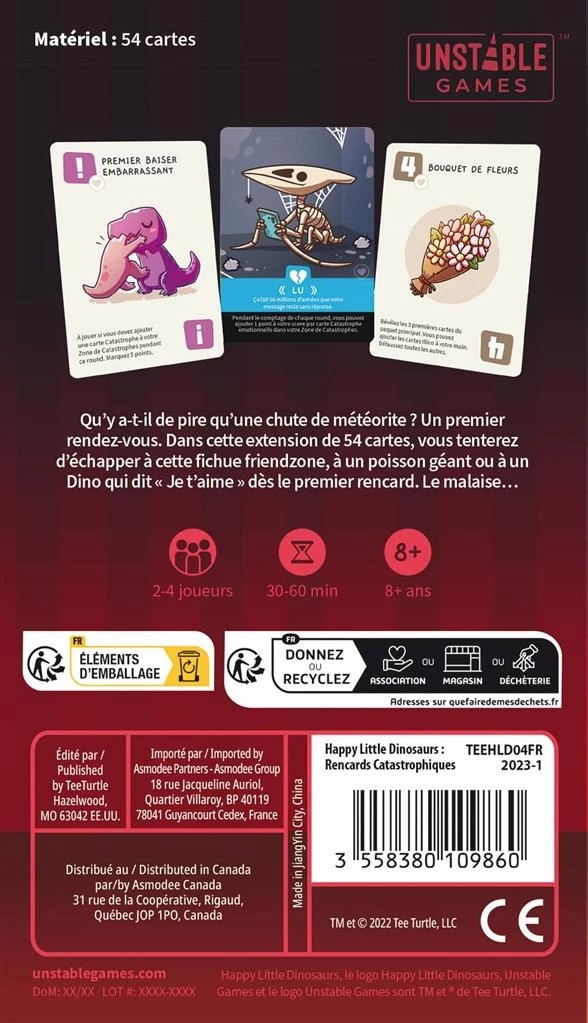 Y’a-t-il quelque chose de pire qu’un mĂ©tĂ©ore qui tombe ? Un premier rendez-vous peut-ĂŞtre. Ce c’est que vous propose l’extension Rencards Catastrophiques. Dans ce pack de 54 cartes, vous pourrez Ă©viter la redoutable friendzone, rencontrer un poisson-chat gĂ©ant ou sortir avec un dino qui vous dit « je t’aime » bien trop tĂ´t. Embarrassant… Pourrez-vous survivre ?