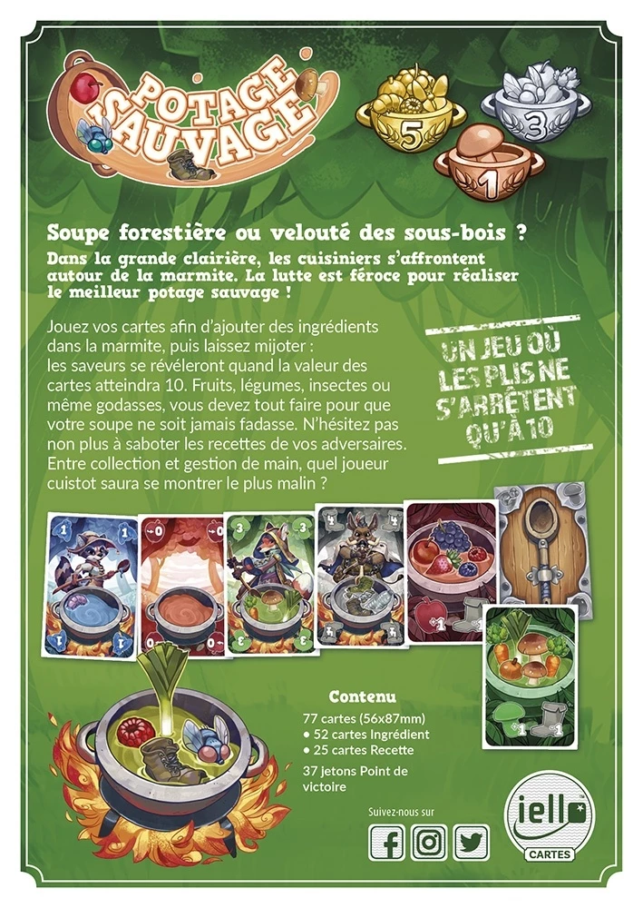 Accessible dès 8 ans, Potage Sauvage est un excellent premier jeu de pli à découvrir en famille. On y retrouve l’efficacité et la malice des grands titres de Reiner Knizia, et le jeu propose également une variante pour plus de diversité. Aussi original que palpitant, Potage Sauvage est une excellente opportunité de découvrir toute la richesse de l’univers des jeux de plis.