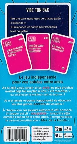 As-tu dĂ©jĂ voulu savoir si tes amis les plus proches avaient dĂ©jĂ fait un plan Ă trois ? Ă©tĂ© menottĂ©s ? ou embrassĂ© le meilleur ami de leur ex ? Je n’ai jamais te donne l’opportunitĂ© de dĂ©couvrir les plus grands secrets de tes amis, Ă€ chaque tour, les joueurs relèvent le dĂ©fi ennoncĂ©, Un joueur est dit « coupable » lorsqu’il a dĂ©jĂ commis l’action de la carte jouĂ©e, Il remporte alors la carte et constitue son « Mur de la Honte ».