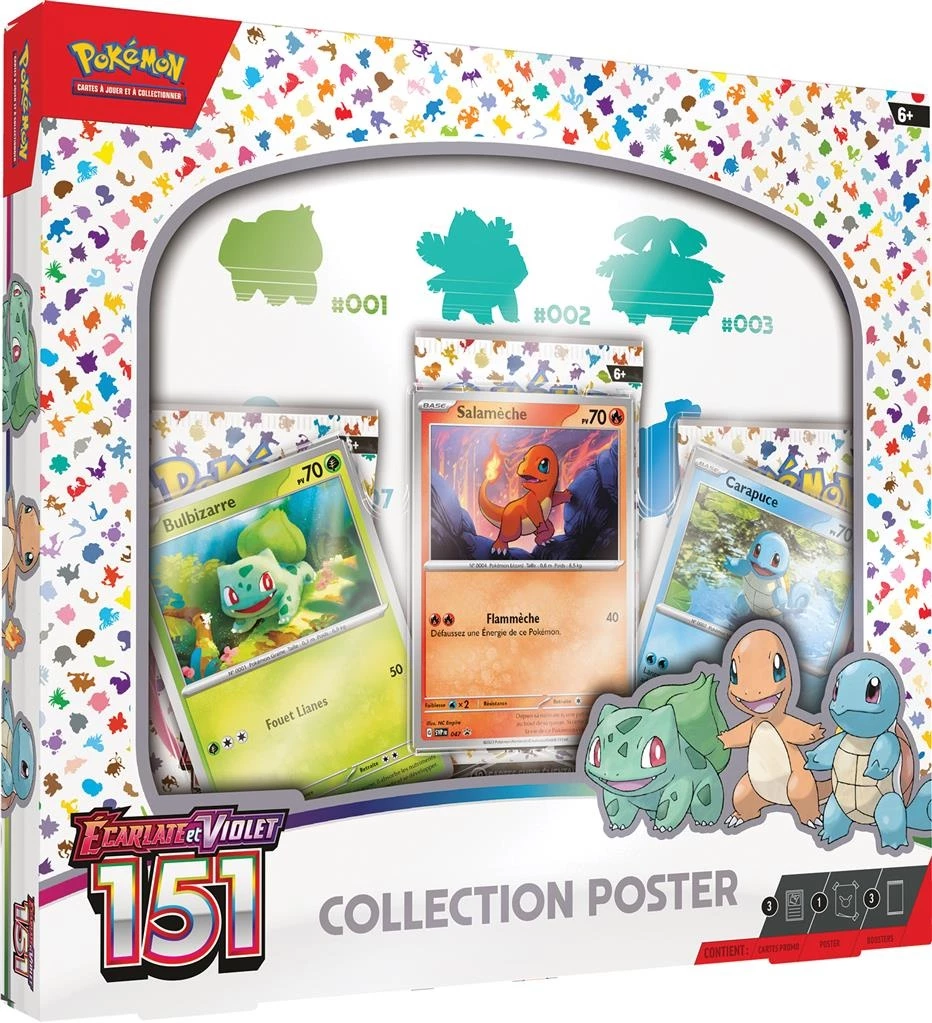 3 cartes promo brillantes de Bulbizarre, Salamèche ou Carapuce, les premiers partenaires, Pokémon de Kanto, 1 poster Écarlate et Violet – 151, 3 boosters Écarlate et Violet – 151 du JCC Pokémon, 1 carte à code pour le JCC Pokémon Live.