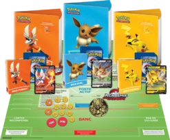 3 decks complets du JCC Pokémon (60 cartes chacun), un Pokémon spécial puissant : Pyrobut-V, Pikachu-V ou Évoli-V (le deck Évoli inclut 2 exemplaires d’une toute nouvelle carte promo d’Ixon de Galar), 1 feuillet d’instructions pour vous aider à préparer la partie, 2 guides d’apprentissage, 1 plateau de jeu, 3 étuis pour ranger vos cartes, 1 livret de règles, 1 grande pièce métallisée de Pyrobut, Pikachu et Évoli, 1 lot de marqueurs de dégâts, 1 carte à code pour le nouveau JCC Pokémon Live.