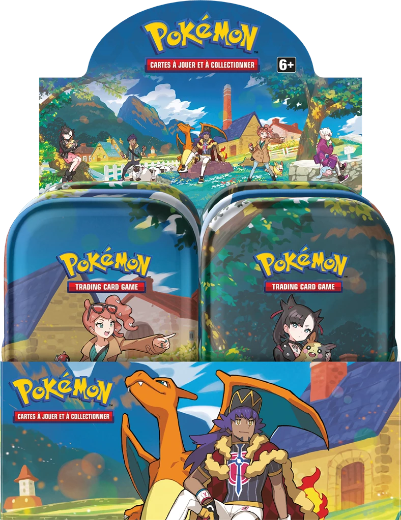 Display de 10 Mini-Tin Pokémon Zénith Suprême EB12.5, contenant 2 Tins de chaque visuels des 5 modèles existants (Dracaufeu, Voltoutou, Morpeko …)