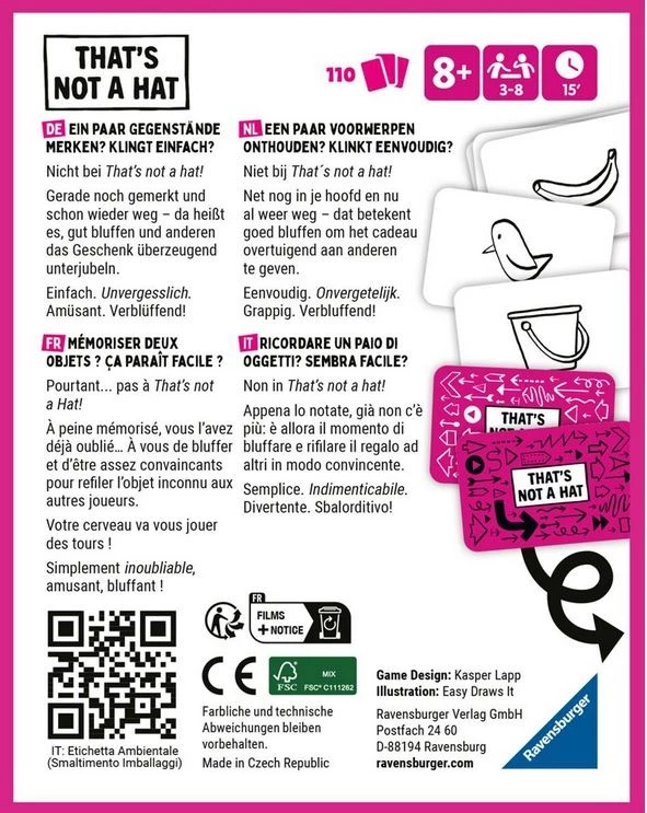 A peine mĂ©morisĂ©, vous l’avez dĂ©jĂ oublié… À vous de bluffer et d’ĂŞtre assez convaincants pour refiler l’objet inconnu aux autres joueurs. Votre cerveau va vous jouer des tours ! Simplement inoubliable, amusant et bluffant !